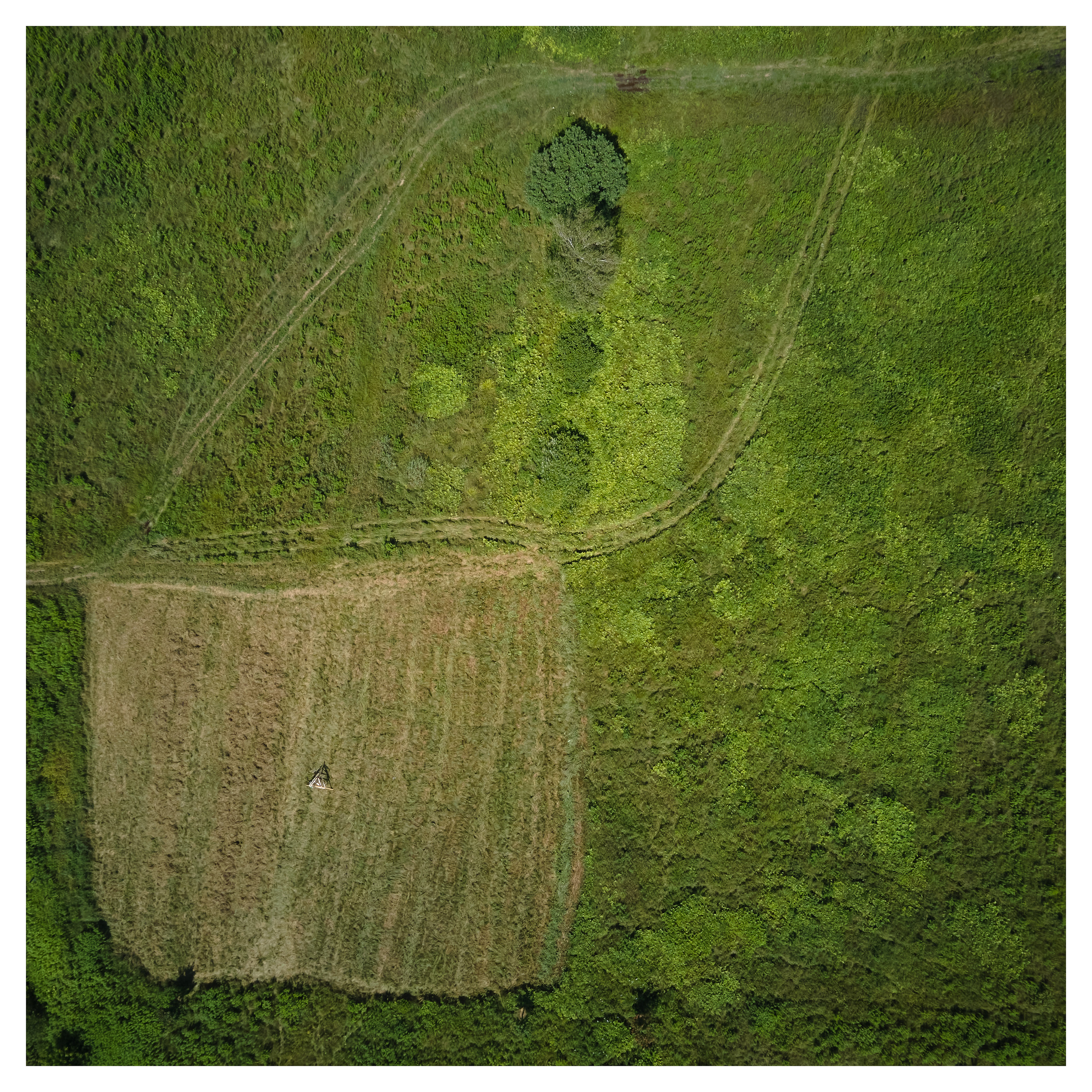 Pendant plusieurs jours, Mériol Lehmann a fait «Les foins», une performance agricole et artistique, qui a mené à une oeuvre vidéo présentée en galerie. Sous l'apparence sobre des longues séquences filmées tantôt du sol, tantôt du ciel avec un drone, se cache une planification longuement réfléchie des angles de vue, des lignes des andains et du contour de la surface à faucher.
